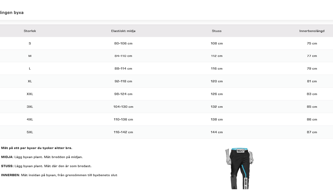 Solingen Byxa Stretch Unisex Svart 4 vägs dragkedja storlekstabell