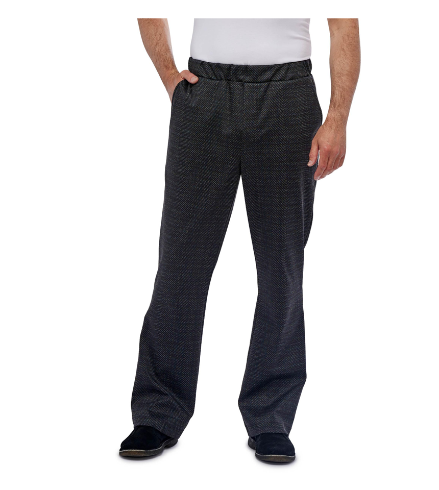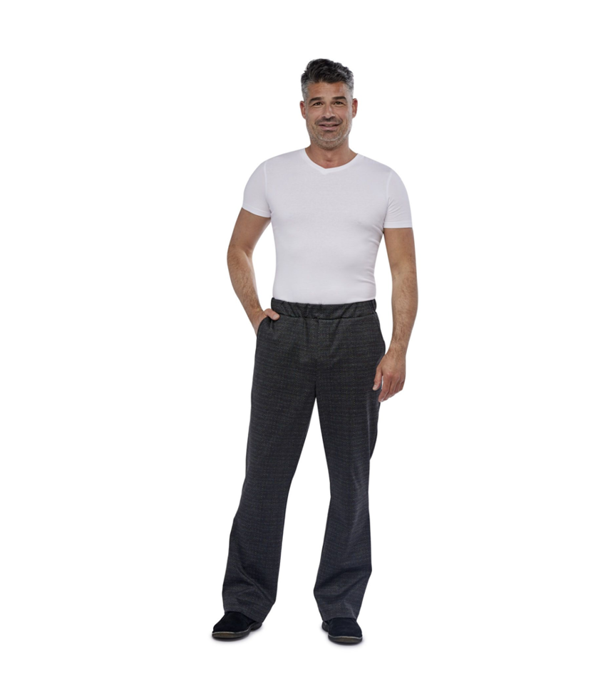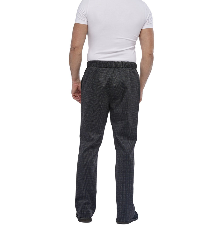 Snygga herrbyxor för gående med normal grenlängd och resår i linningen. Byxor som är lätta att bara dra på med bara en hand utan att besväras av gylf och knapp.