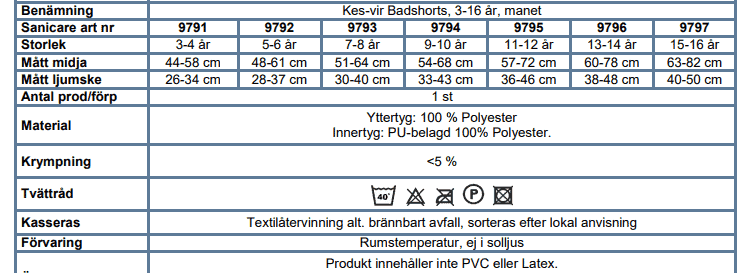 Badbyxa för barn mellan 3-16 år med inkontinens. Badbyxorna är unika på grund av att man inte behöver ett extra inkontinensskydd i badbyxan. ”Två i ett”- yttertyget på badkläderna är som en vanlig badbyxa men med inbyggda innerbyxor som har ett vattentätt tyg, gjorda av andningsbar PU-belagd polyester.